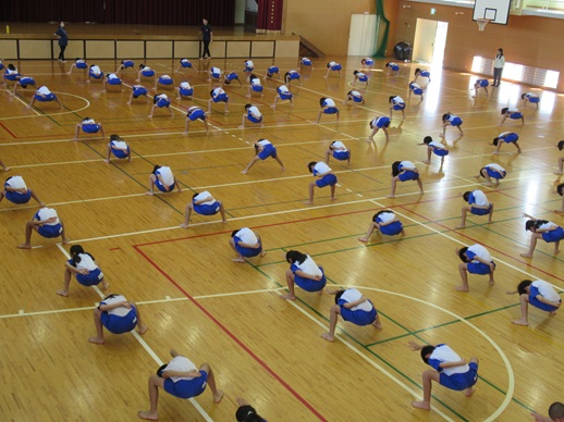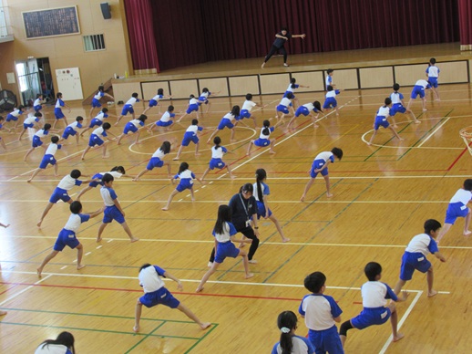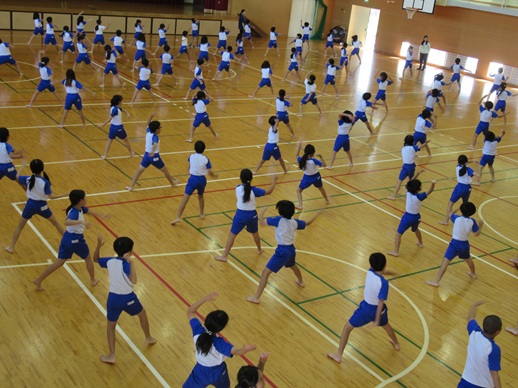 今日の合同体育では、3・4年生全員でソーラン節に取り組んでいました。