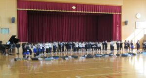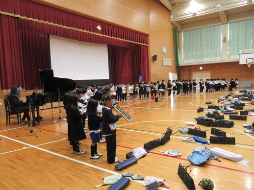 1年生は、校歌の合唱と鍵盤ハーモニカでの「きらきらぼし」の演奏、そして、「やまびこごっこ」の合唱です。