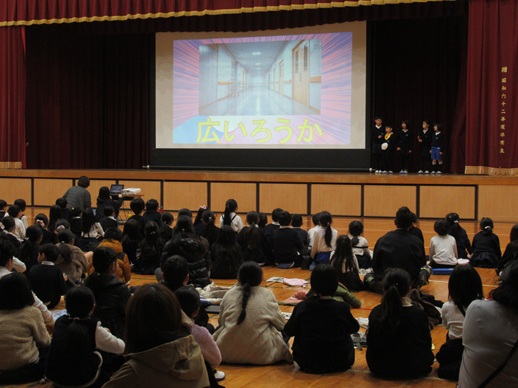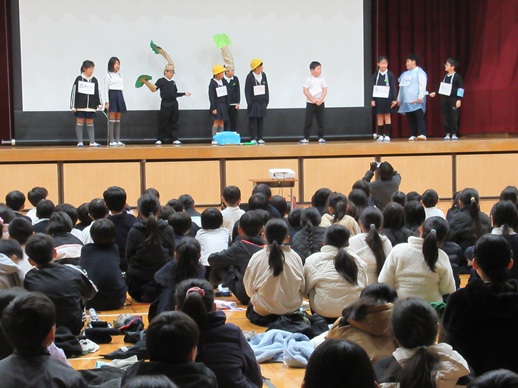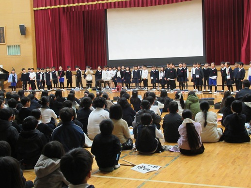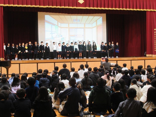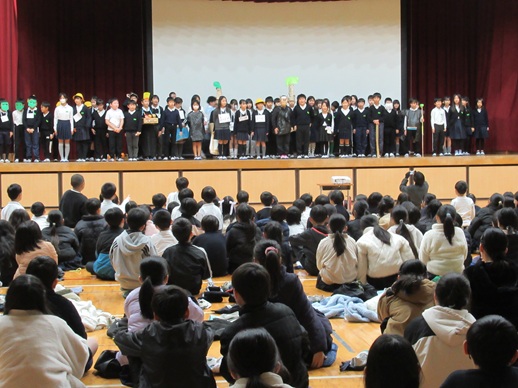 集会は、最初に児童会の歌を全員で歌い、次に1年、3年、4年の順で学年の発表を行いました。
