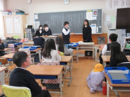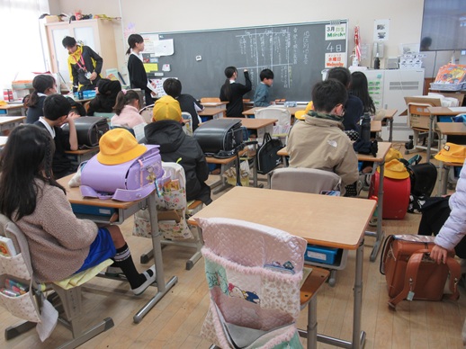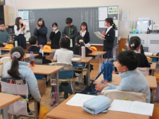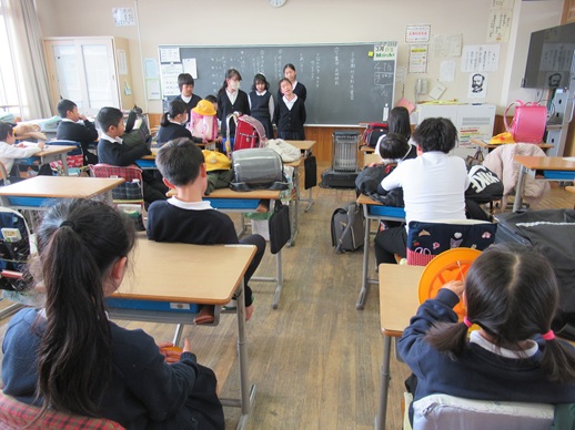 多くの登下校の班長・副班長が6年生からバトンタッチされるので、これまでの班長・副班長とこれからの班長・副班長があいさつをしました。