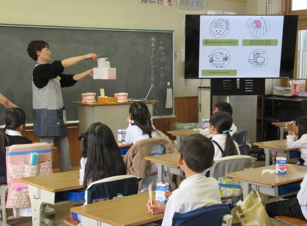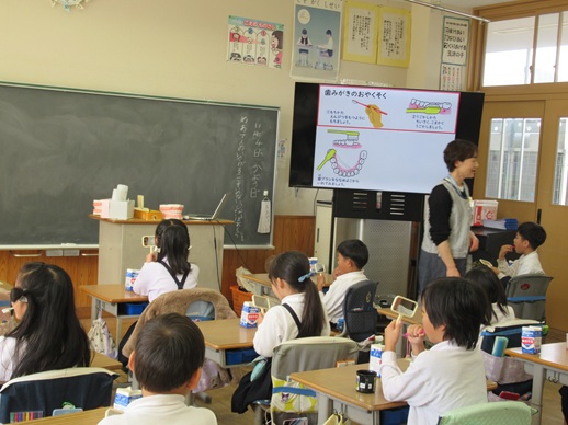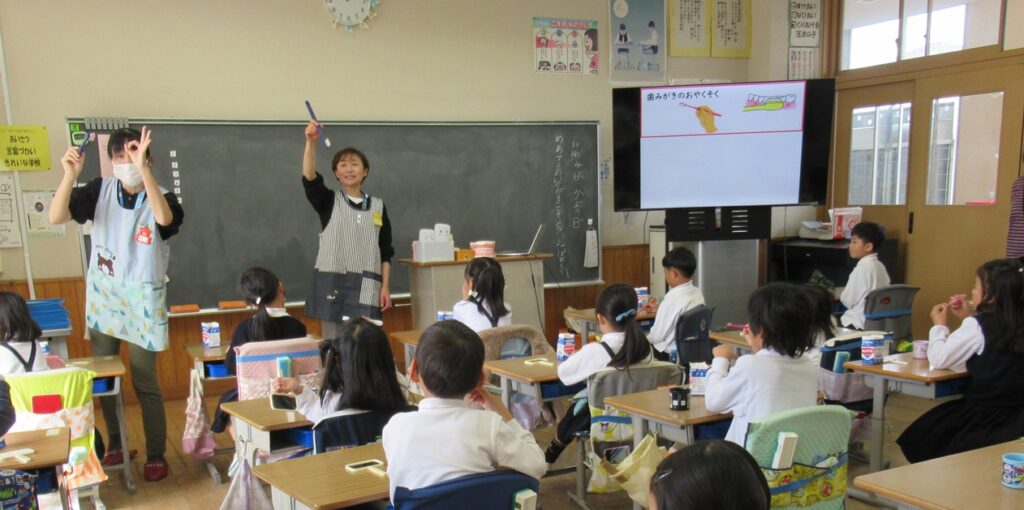 本日、守山市すこやか生活課から、2名の歯科衛生士の方が来てくださって、1年生に歯科指導をしてくださいました。