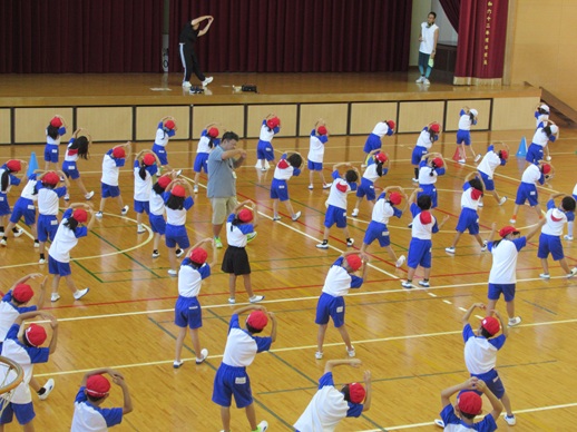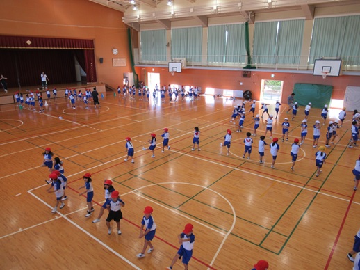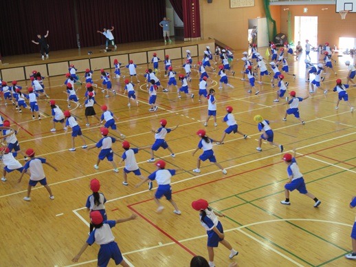 1・2年生は、移動のしかたや移動した後の隊形やダンスを練習していました。タイミングが難しい様子で、カウントで合わせたり、曲で合わせたりしていました。