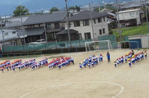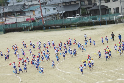 1・2年生は、本番と同じようにスカーフをもって集団演技に取り組みました。