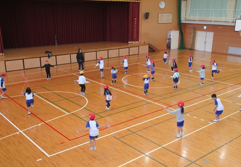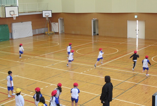 体育館では、かけっこをしたあと、なわとびに取り組んでいました。