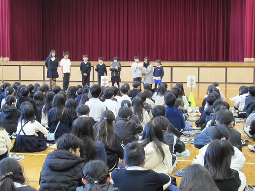 そして、各学年の代表者が「2学期がんばったこと」を発表しました。学習面でがんばったこと、運動会でがんばったこと、校外学習で深く学べたこと、学級のみんなでがんばって取り組んだことなどの発表がありました。